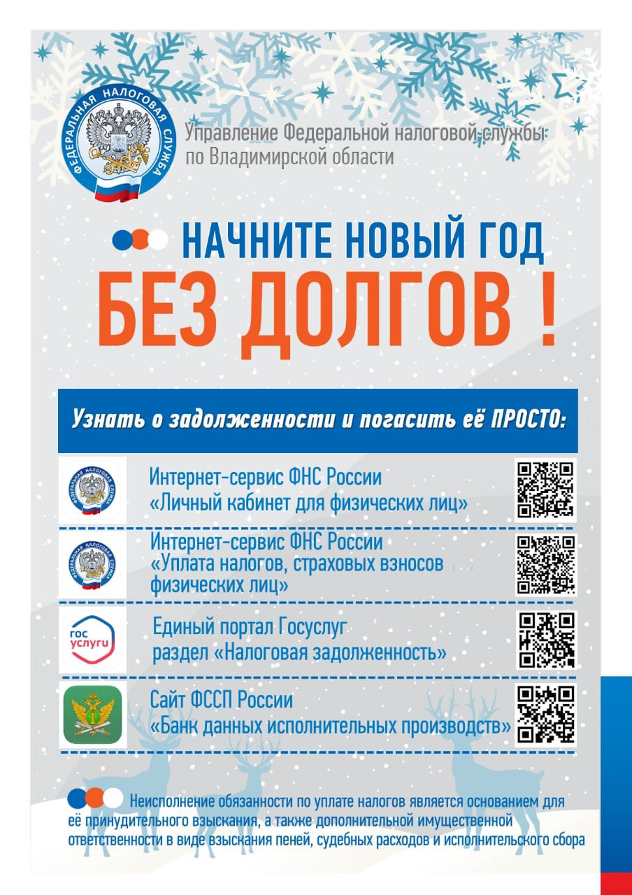 В настоящее время во всех налоговых инспекциях проводится акция «Новый год без долгов», цель которой дать возможность гражданам проверить и оплатить имеющуюся задолженность.