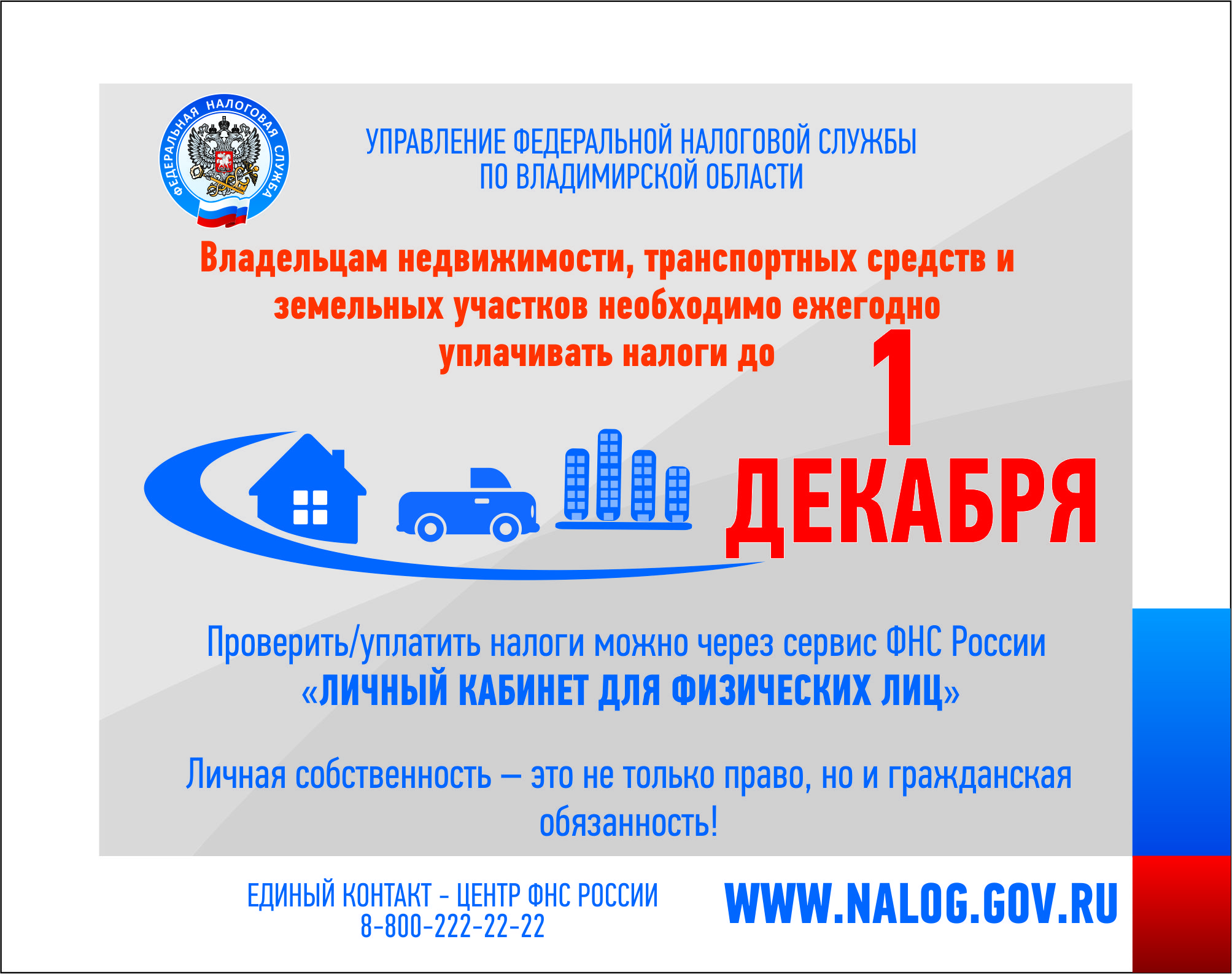 Межрайонная ИФНС России № 10 по Владимирской области информирует, что в настоящее время происходит рассылка налоговых уведомлений физическим лицам для оплаты налогов за 2020 год. Их получают собственники налогооблагаемого имущества: земельных участков, объектов капитального строительства, транспортных средств.